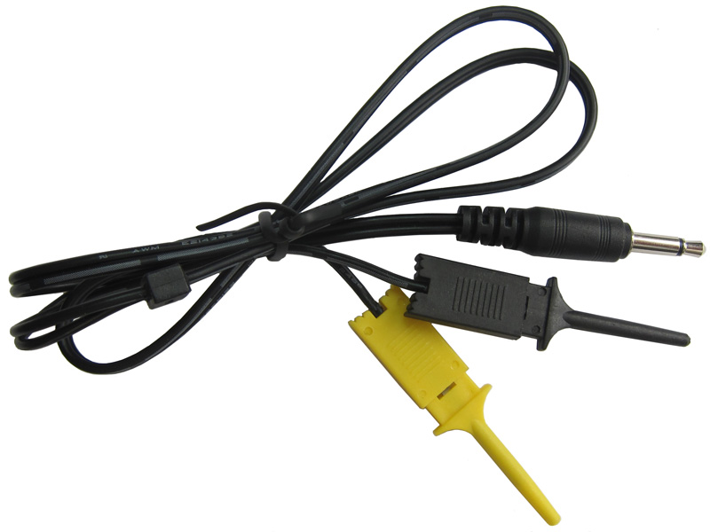 Hook clips probe, 3.5mm plug. Compatible with the Xprotolab Portable and Xminilab Portable.These are the probes for the Xprotolab Portable and Xminilab Portable. This is a probe that uses a 3.5mm stereo audio plug. The length of the cable is about 60cm. The probes ends are hook clips.