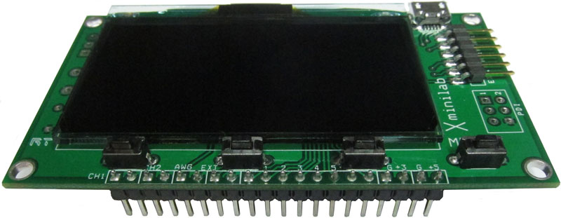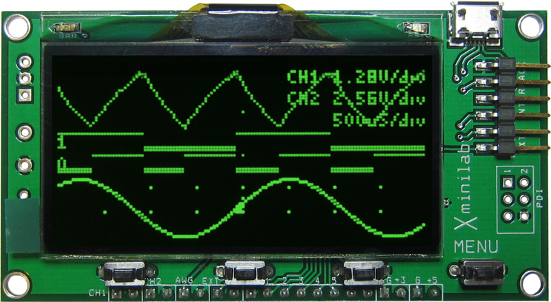 The Xminilab is a mixed signal oscilloscope with an arbitrary waveform generator in a DIP module. It measures only 3.3 x 1.75 inches, and can be mounted directly on a breadboard. The Xminilab can also be used as a development board for the AVR XMEGA microcontroller.